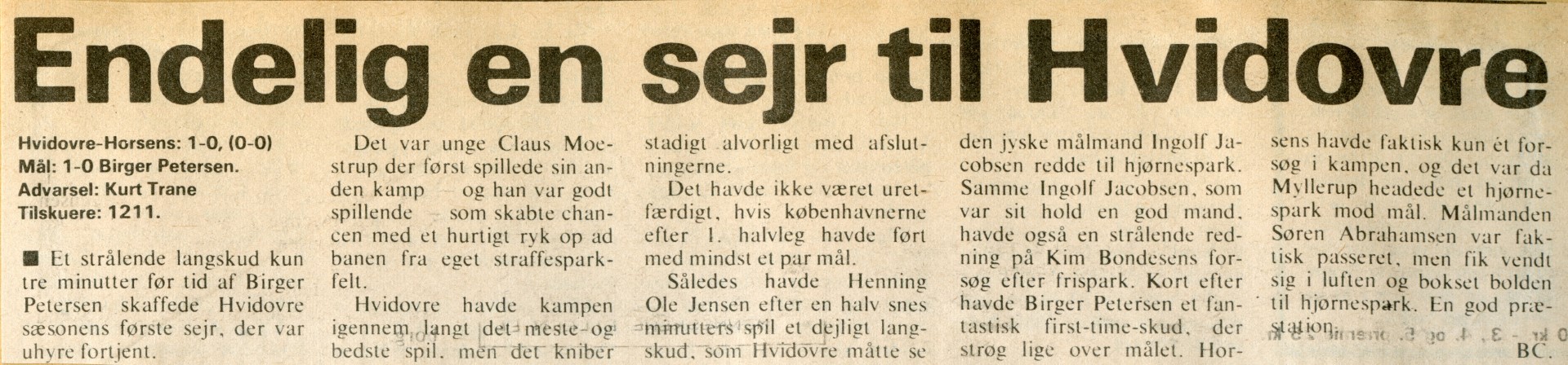 Så kom årets første sejr, i den 11. kamp. Men den blev først sikret tre minutter før tid. Birger Pedersen var matchvinder med et brag af et mål. Optakten var lige så imponerende. Unge Claus Moestrup gik flot igennem i højre side og afleverede skråt tilbage til Birger Pedersen.