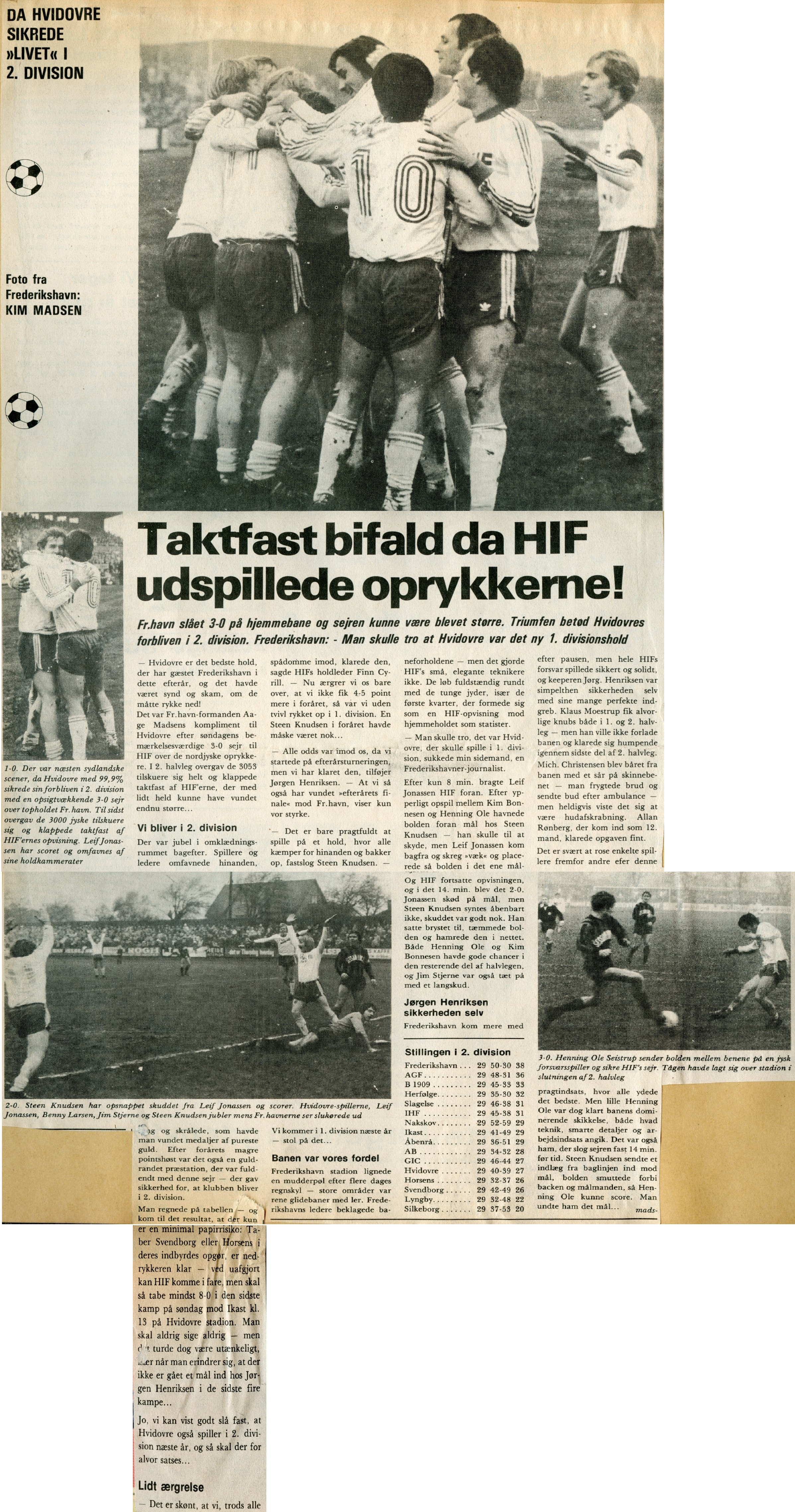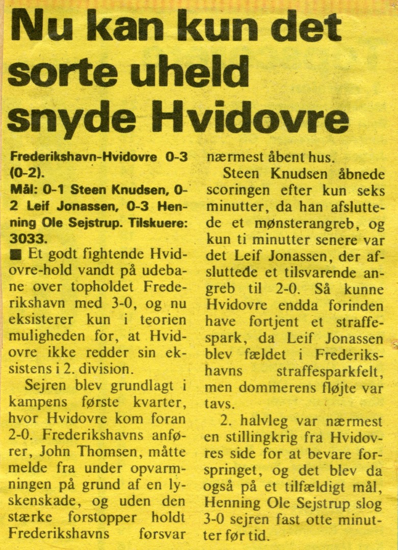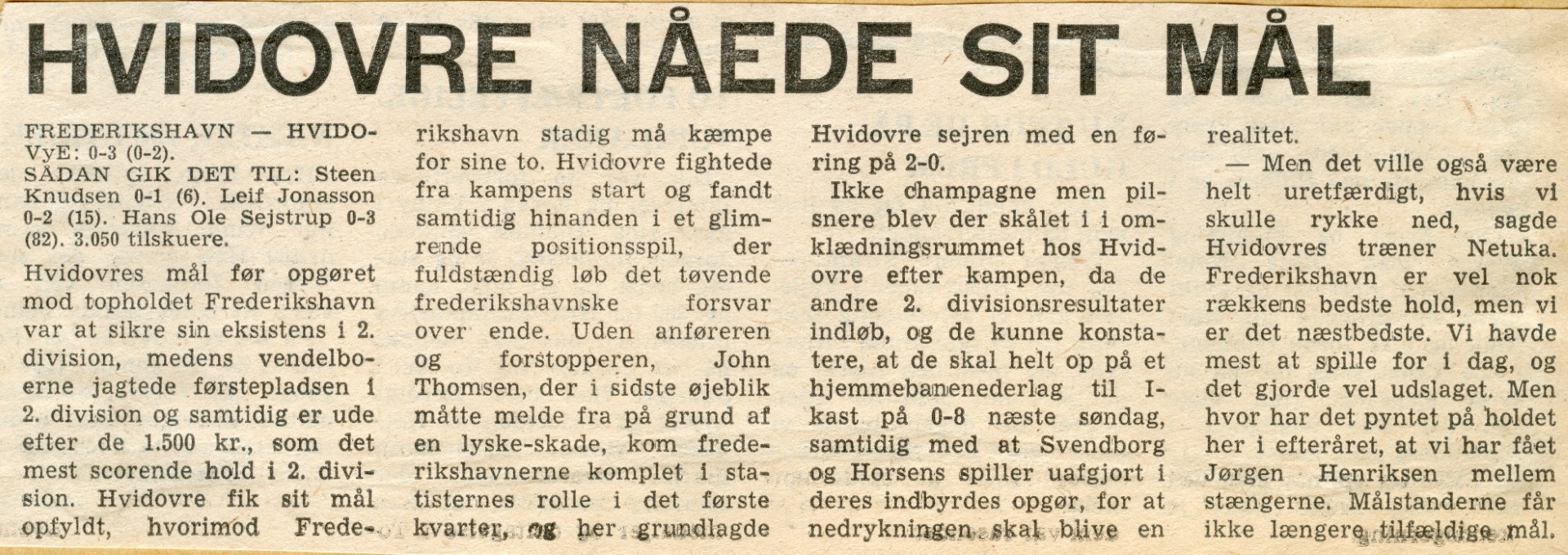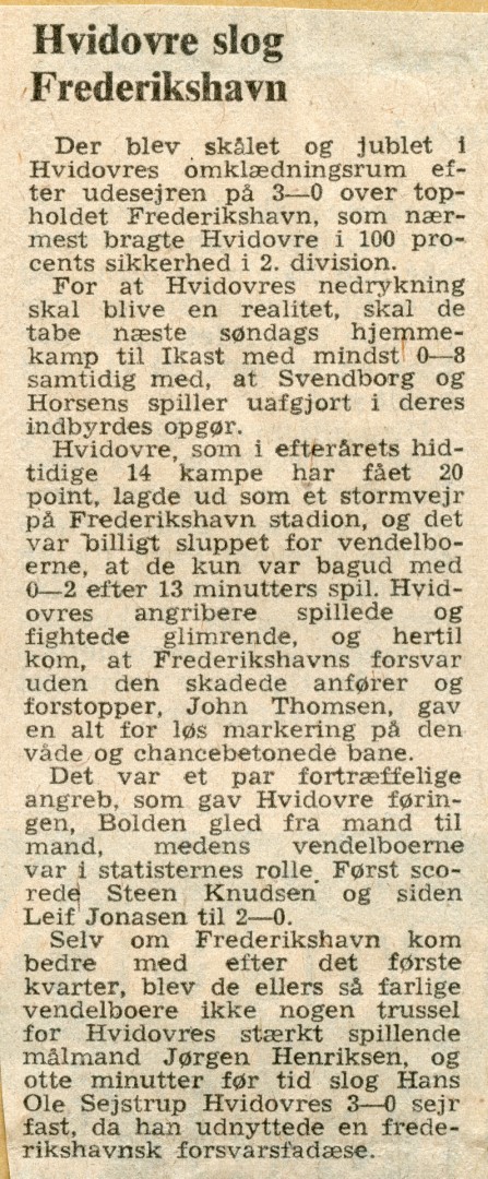 Årbogen 1976 af Finn CyrilSejr over topholdet.Endelig sikrede Hvidovre sig. Med denne flotte sejr over det hidtil suveræne Frederikshavner-hold var nedrykning til 3. division kun mulig i teorien. Frederikshavns formand, Aage Madsen, gav Hvidovre den kompliment, at holdet var det bedste, som havde gæstet Frederikshavn i efteråret. Besnærende var det også, når HIF'erne kombinerede sig igennem. Det gav mål efter 10 minutter ved Leif Jonassen, og fem minutter efter ved Steen Knudsen. Henning Seistrup scorede målet i 2. halvleg. Det kan nok være, der var jubel i HIF-lejren efter kampen.