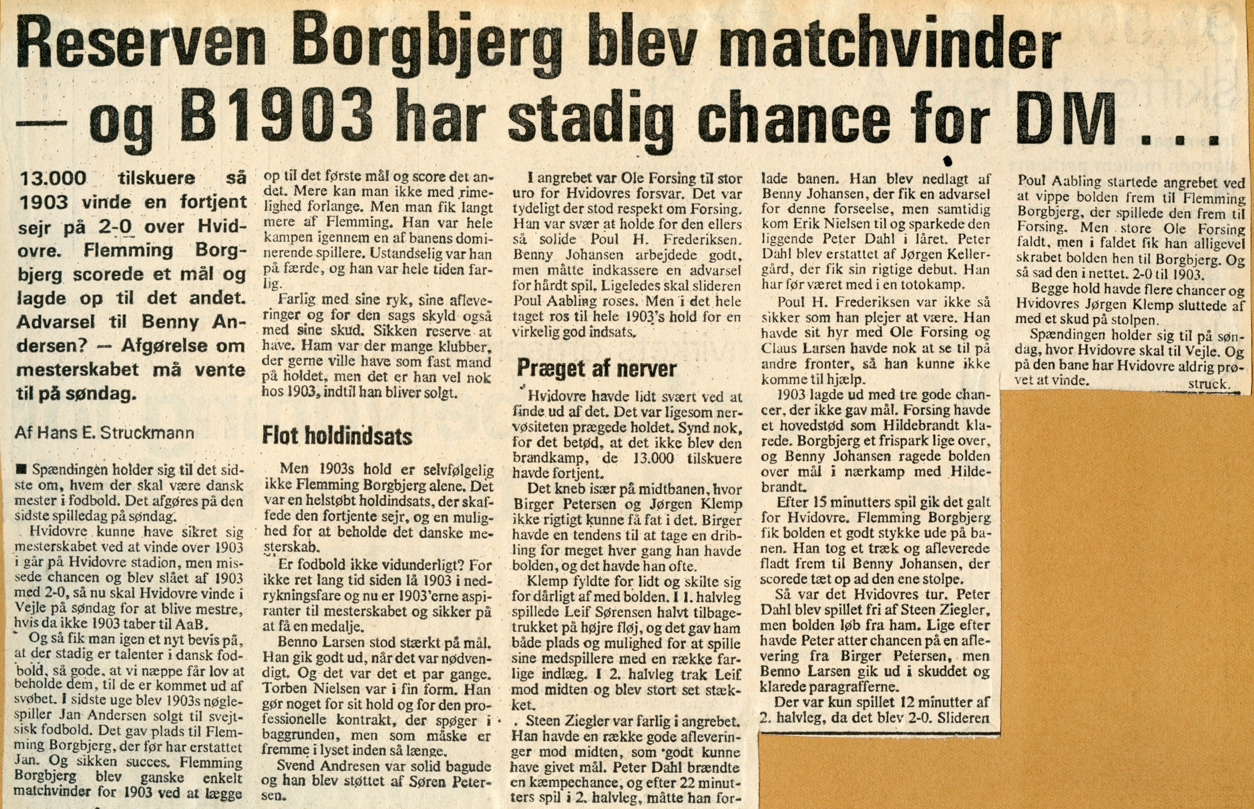 Imidlertid var det hans substitut Flemming Bovbjerg, som fik afgørende betydning for kampen. Han var med i det første mål, som Benny Johansen scorede, og var selv mester for det andet.