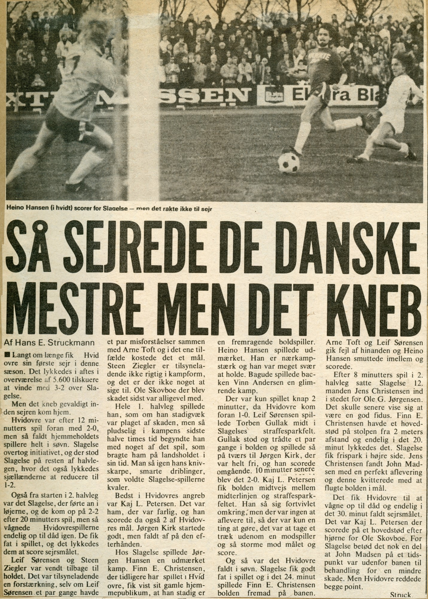 Med periodevis smukt og teknisk raffineret spil overtog det nye 1. divisionshold fra Slagelse initiativet, og på mål af Heino Hansen i 1. halvleg og John Madsen midt i 2. halvleg lignede det mest et nyt nederlag til Hvidovre. Men et kvarter før tid scorede Kai L. Pedersen på hovedstød efter hjørnespark det afgørende mål - og Hvidovre gled lidt væk fra bundplaceringerne.