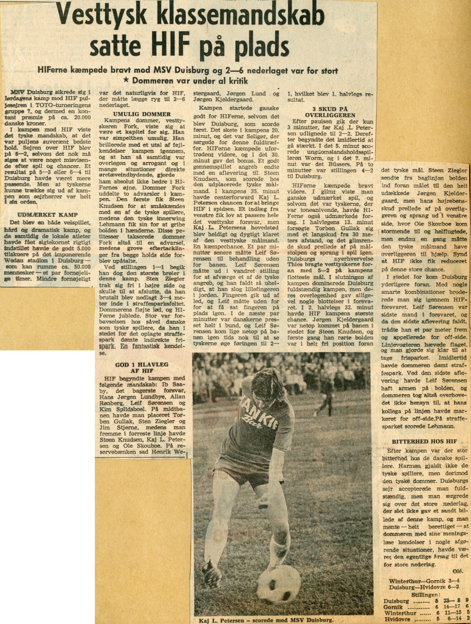 Duisburg var et vesttysk klassemandskab - og vinder af puljen. Holdet spillede direkte, effektivt fodbold – og resultatet blev derefter. Selv om Hvidovre med megen ret kunne hævde, at der langt fra var tale om en afklapsning, sådan som cifrene kunne antyde. Specielt i 1. halvleg spillede Hvidovre udmærket, og det var helt fortjent, at Steen Knudsen udlignede til 1–1.