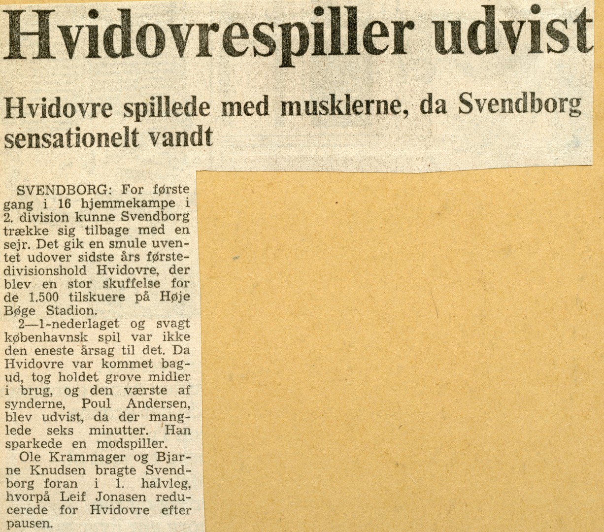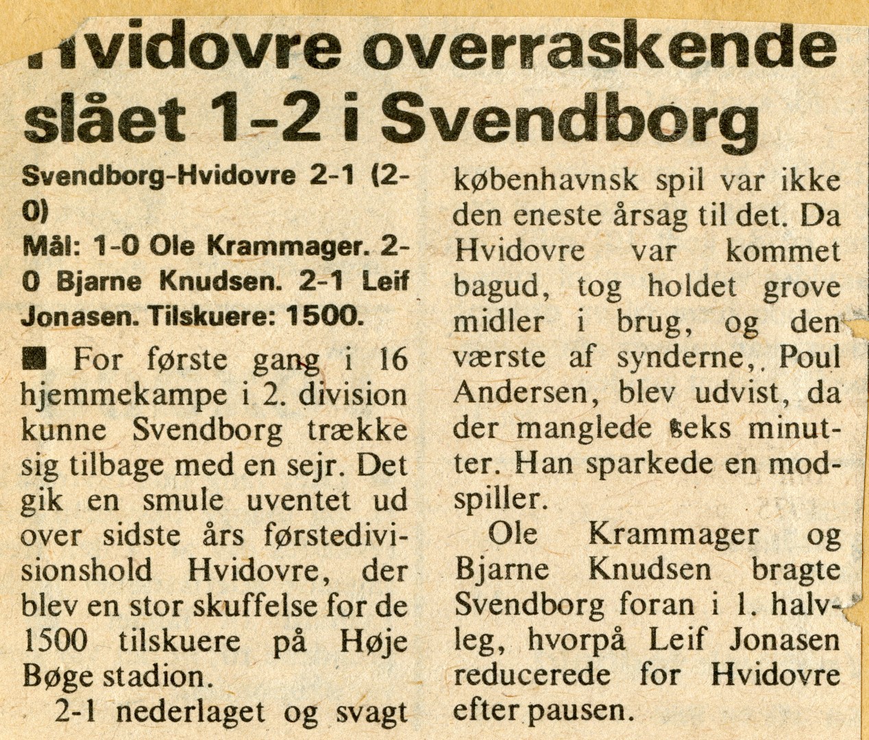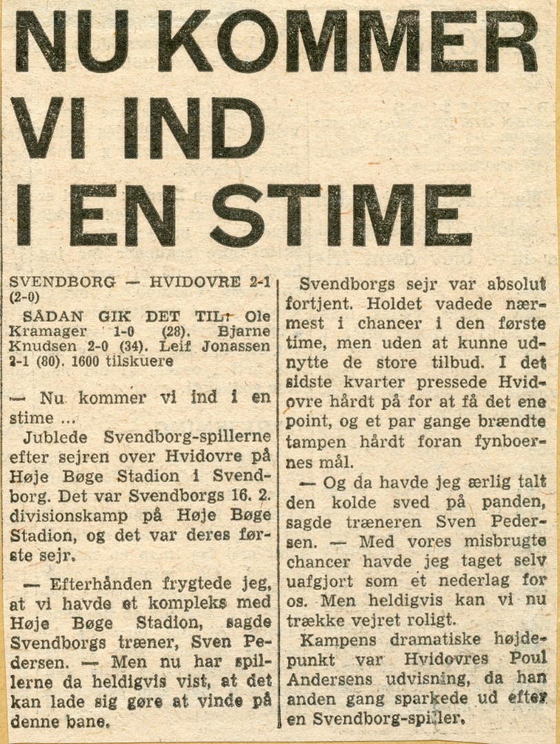 Svendborg kom foran efter 20 minutter ved Ole Krammager (off side?) og øgede til 2-0 ved Bjarne Knudsen på straffespark, dømt mod Jørgen Lund (regulær skuldertackling?). HIF pressede voldsomt til sidst, især efter at Leif Jonassen 10 minutter før tid havde reduceret.