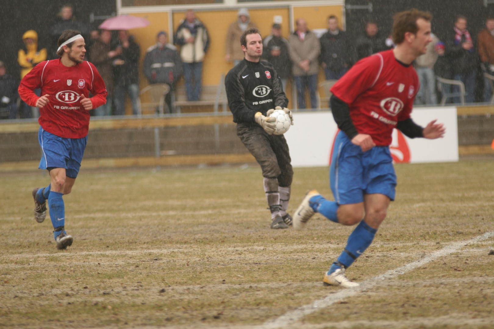 Et voldsomt regnvejr på dette tidspunkt, har presset mig op under BSV's "tribune-halvtag", og herfra er det desværre kun muligt at følge ordentligt med på halvdelen af banen. En HIF'er laver frispark, og Lasse Rostholm, der står i nærheden, bliver skubbet væk af en BSV-spiller. Helt uforståeligt hiver Kim Milton, som var dommer i dag, det gule kort op til Lasse, og det bliver naturligvis udskiftet med et rødt. Død ærgerligt, og for dem, der stod lige i nærheden, var det totalt uforståeligt. Det virker nu, som om det er nemmere at få gult for brok og trækken tiden ud, end for at lave frispark, uanset grovheden. Jeg talte i første halvleg tre frispark, som burde have givet gult til BSV og et par stykker til HIF, men intet kort blev hevet op. Den linje forstår jeg absolut ikke. Det var svagt Kim Milton, og du dømte ellers resten af kampen, særdeles fremragende. Dog skal det lige siges omkring Lasse Rostholm. Jeg nævnte det sidste gang, det KAN blive dyrt for HIF, med de hjerneblødninger som han ind i mellem får, men lige præcis det andet kort, var uforståeligt. HIF holder dog, trods 10 mand, et godt pres, og det var til tider ikke til at se, at de var i undertal. BSV var stadig farlige, når de holdt bolden nede på banen, og når de havde indlæg i det lille felt, men de store åbne chancer blev det ikke til. HIF havde til gengæld tre store muligheder for yderligere scoring, hvor Lars Hjortshøj nok havde den største, da han på et indlæg fra venstre spilles helt blank, men hans inderside går ved siden af, og han selv forsætter ind i målet. Til hans forsvar skal dog lige siges, at han kun havde været på banen i 1-2 minutter, og nok var lidt kold endnu. Men ellers kæmpede alle forbilledligt, og med 11 mand i hele kampen, havde den nok også været vundet, men det kan man jo nu kun gisne om.