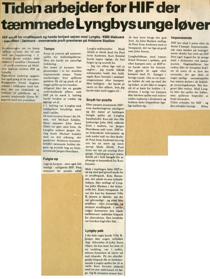 Lyngbys Michael Schäfer udtaler: "Tacklingerne var uanstændige". Han hørte en Hvidovre-leder der opfordrede John Steen Olsen til at skræmme Schäfer. I øvrigt mente Schäfer at tacklingerne kun burde komme forfra, så man kunne nå at hoppe væk i tide.