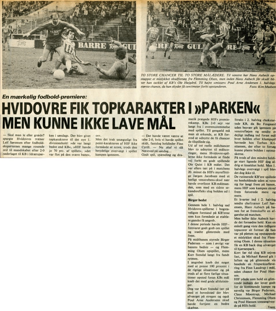 Årets første turneringskamp var i Idrætsparken, hvor modstanderen var KB, og hele 6.100 tilskuere var mødt op med forventningens glæde lysende ud af øjnene. Hvidovre startede klart bedst og havde KB'erne helt på hælene i hele første halvleg, men KB kom alligevel foran 1-0 inden pausen. KB scorede til 2-0 i anden halvleg, hvilket blev kampens resultat, der nok var blevet anderledes, hvis Hvidovres 12. mand Hans Aabech havde scoret på den store chance, han havde ved stillingen 1-0. Dagspressen var i det store og hele meget tilfreds med Hvidovres indsats, og især Birger Pedersen blev overhængt med superlativer, hvilket var yderst fortjent.