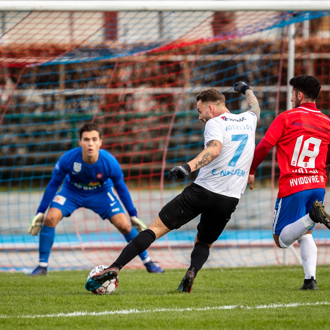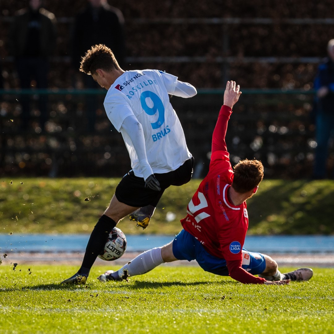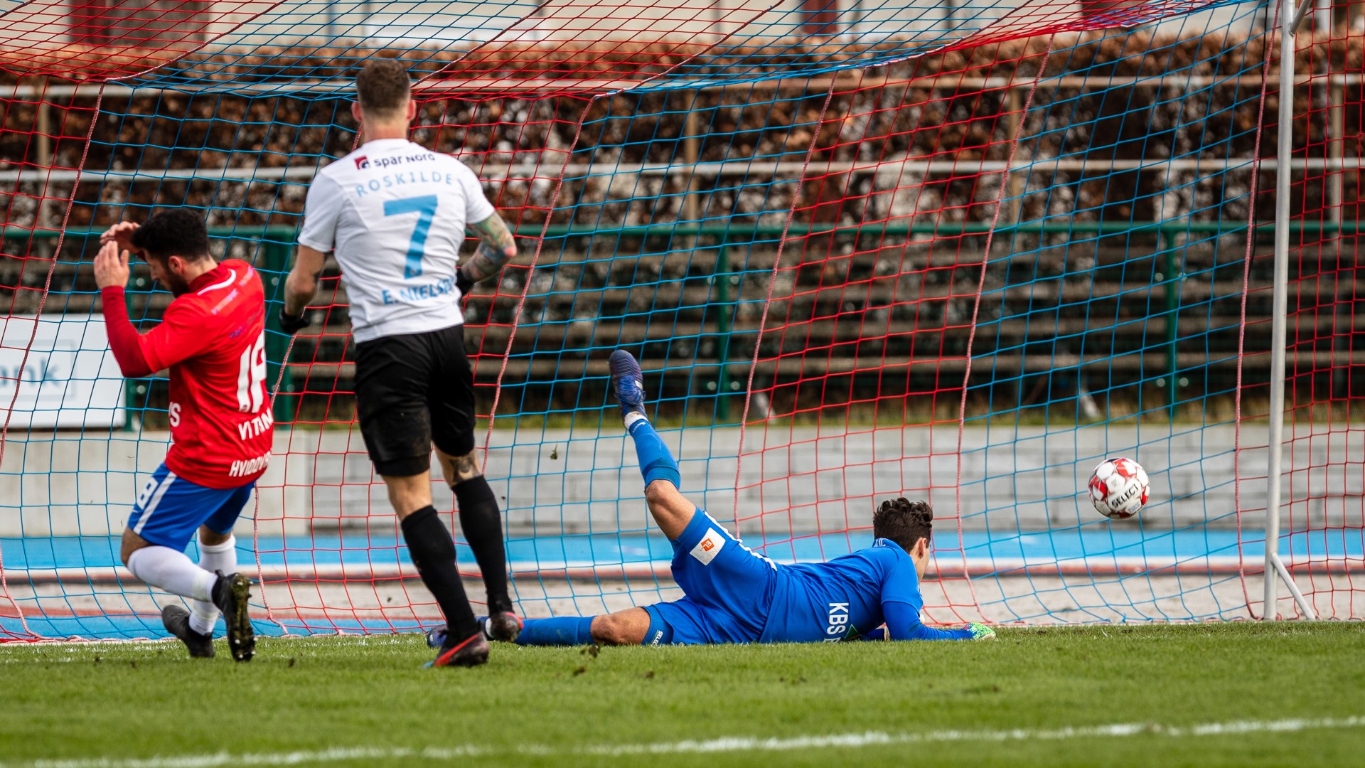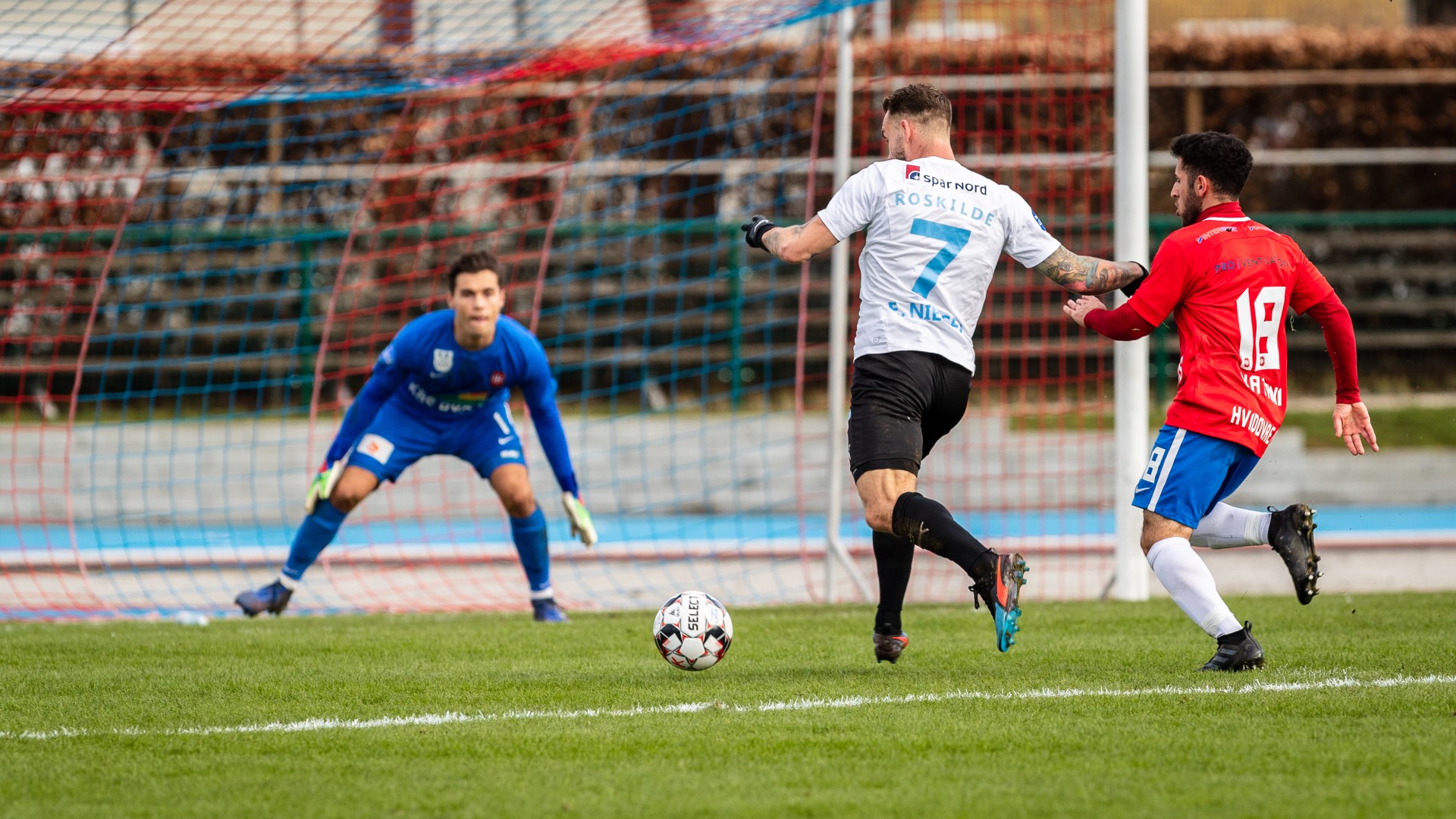 Den overraskende sejr i Viborg i sidste uge, skulle i dag følges op mod FC Roskilde, der inden dagens opgør var placeret sidst i tabellen. HIF startede med en kraftig modvind, og det udnyttede Roskilde. I det 5. minut får FC Roskilde hjørnespark, og det sendes, med vindens hjælp, ind omkring stregen i Hvidovres mål. Her dukker den tidligere HIF'er Stefan Hansen op, og header bolden ind over stregen til en tidlig Roskilde-føring. Kort tid efter, er det ved at gentage sig, men i denne omgang slipper HIF med skrækken. I det 22. minut får Hvidovre-mandskabet en kæmpe mulighed, da Kim Aabech lægger en perfekt bold ind i det lille felt, hvor Nicklas Bjerre Schmidt står placeret, og han drejer bolden med hovedet mod Roskilde-målet. Desværre for HIF vælger Roskildes målmand at diske op med en hurtig reaktion, og ingen udligning i denne omgang. 5 minutter senere får HIF endnu en god mulighed efter indlæg fra Frederik Emil Andersen, men hverken Lirim Qamili eller Alexandar Lazarevitz ram på bolden, og så får Roskilde sparket væk. I det 33. minut sendes en høj bold ind på HIFs banehalvdel, og bageste mand, Emil Vatani, får ikke stoppet bolden, som ryger under hans fod, og hen til Emil Larsen, der får frit løb mod mål. Vatani vender rundt og løber ham næsten op, men Emil Larsen stopper op ind i HIF-feltet, og med indersiden sender han bolden uden om Filip Djukic og ind ved fjerneste stolpe. HIF får en gylden mulighed for reduktion blot 3 minutter senere, da der tilkendes et straffespark for hånd på bolden i feltet. Kim Aabech sættes til at sparke, og han forsøger at placere bolden ude ved venstre stolpe, men desværre for Aabech og HIF, tager bolden indersiden, og løber på tværs lige foran mållinjen.