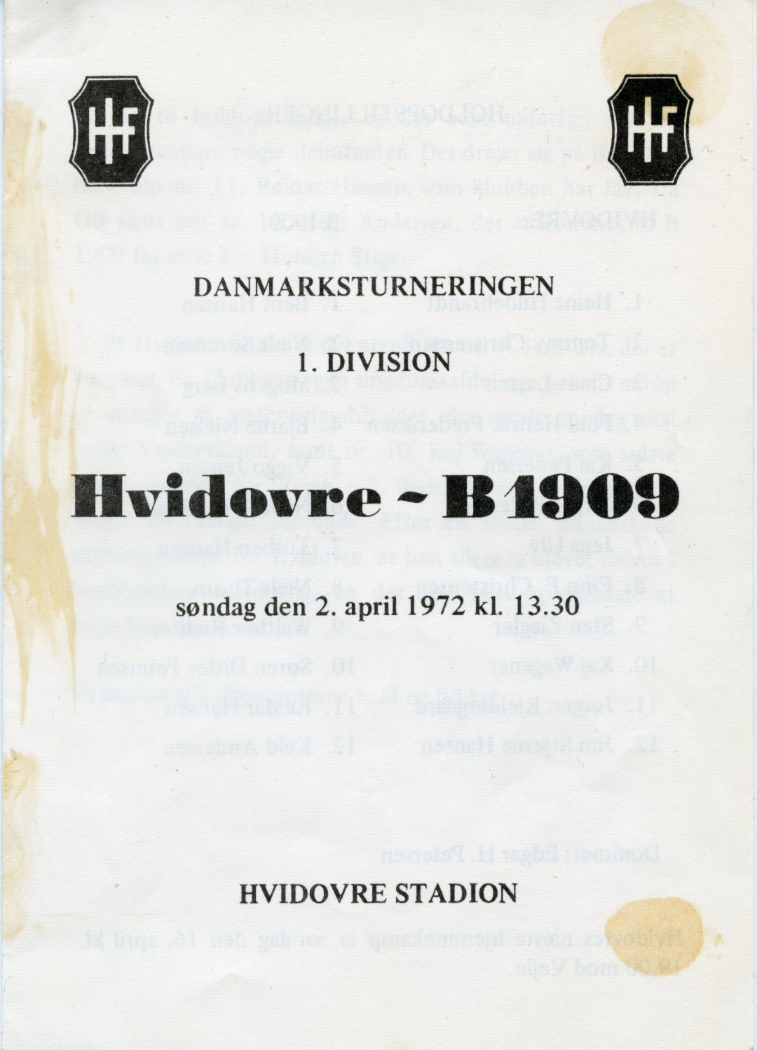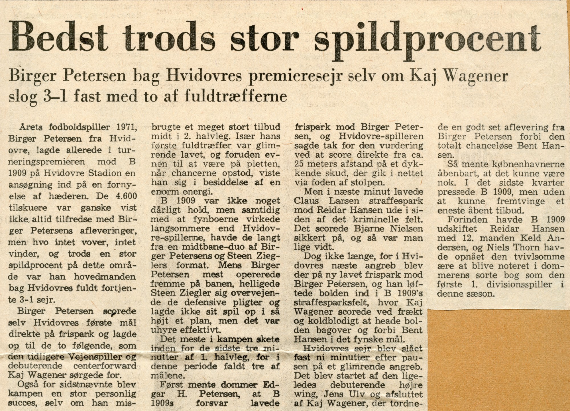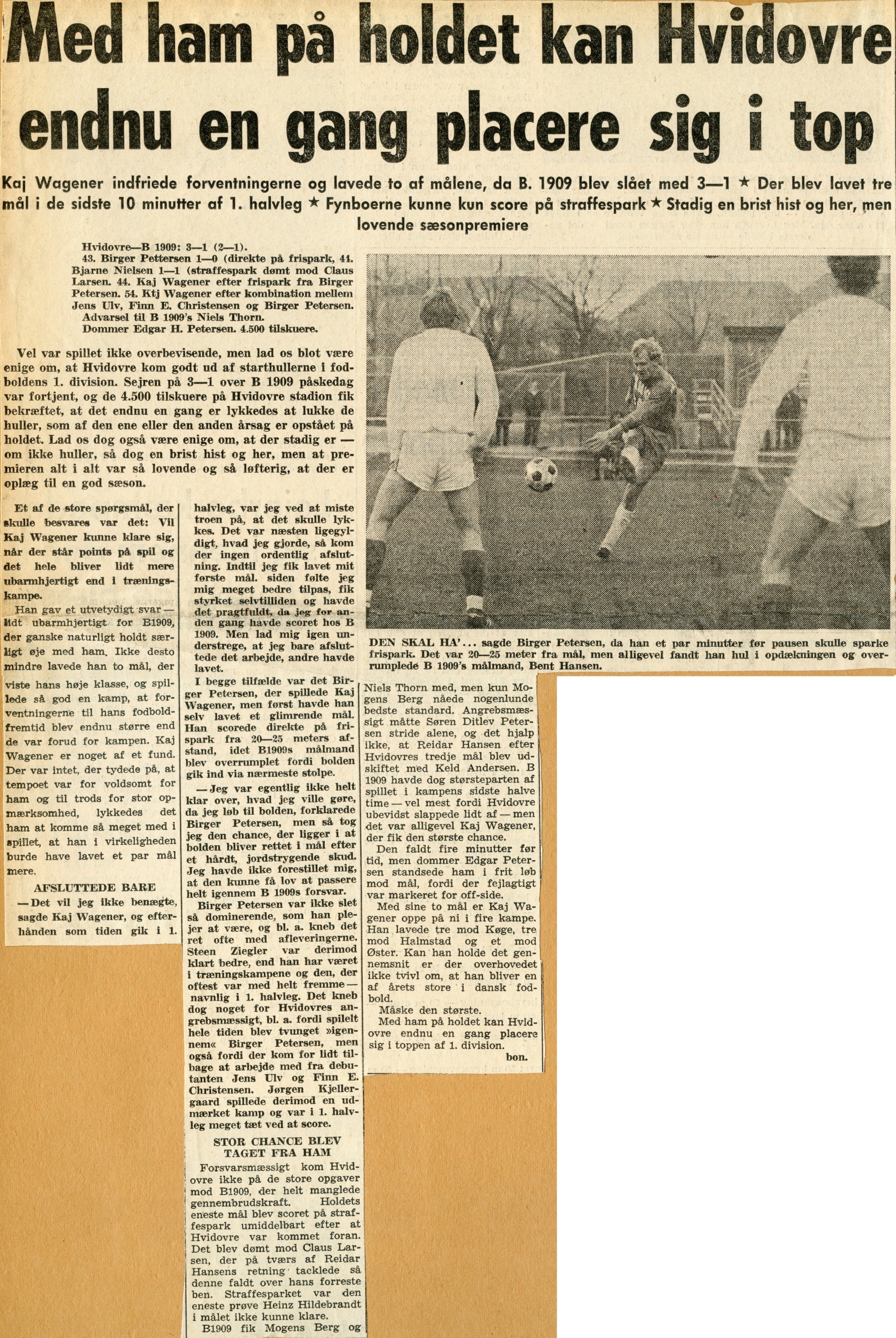 Jens Ulv og Kaj Wagener debuterede, og den sidstnævnte svarede helt til det ry som målsluger, han havde fået i træningskampene. Han scorede Hvidovres to sidste mål. Birger Pedersen havde lavet premieremålet på et frispark langt ude fra. B 1909's mål blev scoret på straffespark af Bjarne Nielsen og gav udligning til 1-1. Forseelsen blev begået af Claus Larsen.