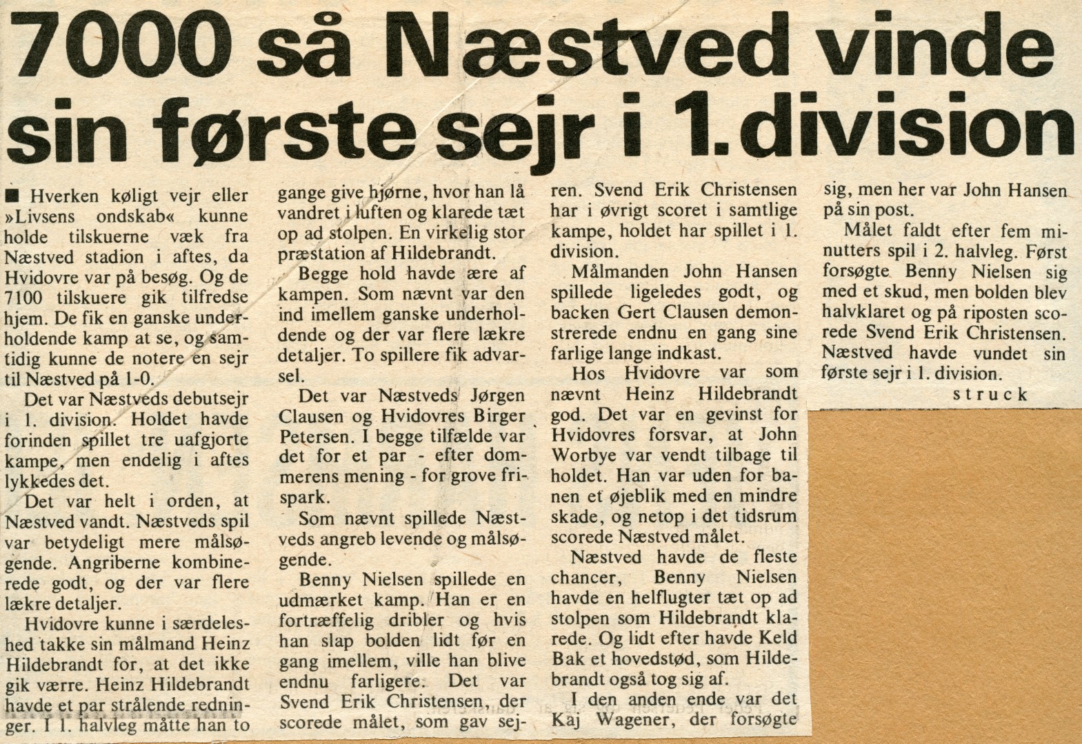 Én fejl — og den blev dyrMaltrakteringen af Vejle havde givet UK noget at spekulere på — hvortil kom, at et par spillere var skadet. Jørgen Lund og Jim Stjerne Hansen debuterede og var med i stedet for henholdsvis Poul Henrik Frederiksen, der var skadet, og Jens Ulv. John Worbye havde come-back efter sin udlandsfærd — var med i stedet for Kai Petersen — og Torben Gullak havde sin egentlige debut og erstattede Jørgen Kjeldergaard. Kampen var udmærket, rent underholdningsmæssigt, men nedsablingen af Vejle gjorde dog stadig indtryk. Heinz Hildebrandt spillede en meget fin kamp, men begik én fejl. Han var uopmærksom, da Svend Erik Christensen skød —og det vandt Næstved på.