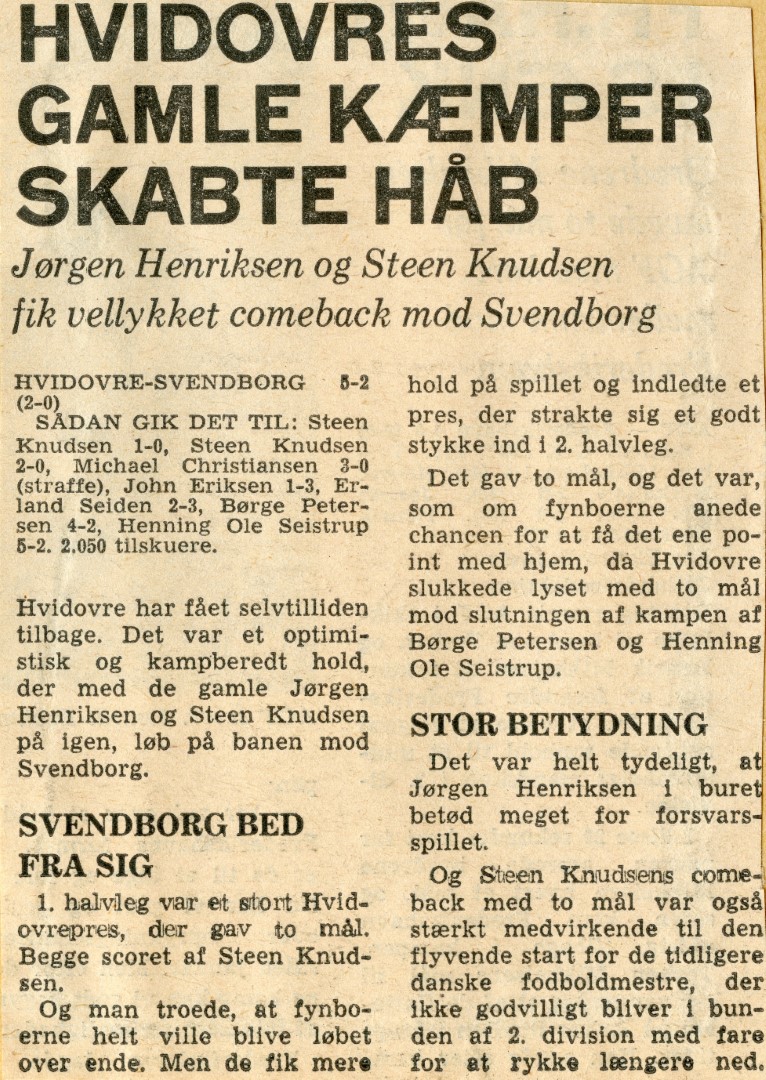Hvidovre fik en forrygende start på efterårssæsonen - og det var også nødvendigt, hvis holdet skulle redde sig fri fra nedrykning. Jørgen Henriksen var vendt tilbage fra prof-tilværelsen, Steen Knudsen var atter i HIF-dragten, og Kai Petersen var mobiliseret fra motionisternes række.